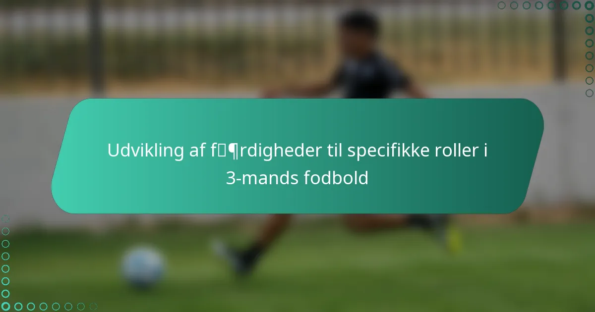At udvikle specifikke færdigheder for hver rolle i 3-mands fodbold er afgørende for at maksimere holdets præstation. Forsvarsspillere skal fokusere på positionering og kommunikation, mens midtbanespillere bør forbedre deres boldkontrol og spilintelligens. Angribere skal forfine deres afslutninger og bevægelsesstrategier for effektivt at bidrage til både angreb og forsvar.